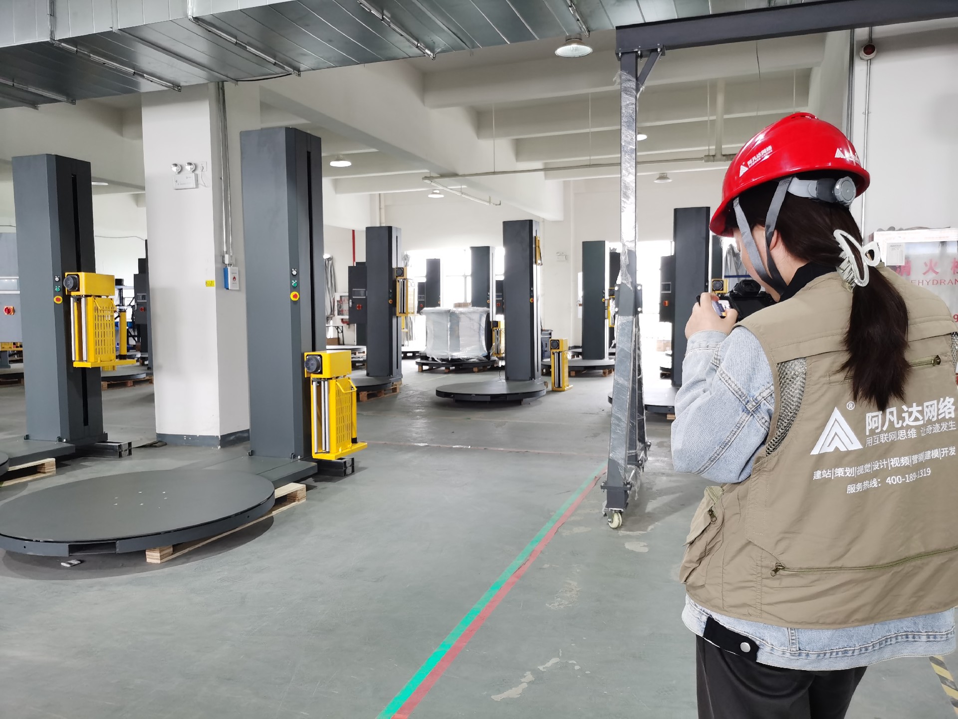 二樓會議室里,雙方就標(biāo)準(zhǔn)化產(chǎn)品的電商呈現(xiàn)策略展開深度溝通。不同于非標(biāo)設(shè)備的定制化展示,此次拍攝需突出產(chǎn)品的通用性、易用性及核心性能參數(shù)。帶著明確的創(chuàng)作框架,團(tuán)隊來到三樓成品倉庫。幾十臺臺銀灰色標(biāo)準(zhǔn)化纏繞機(jī)整齊列陣,金屬機(jī)身在專業(yè)燈光下泛著科技質(zhì)感,控制面板的數(shù)字化界面、自動感應(yīng)的膜架等細(xì)節(jié)被逐一捕捉。